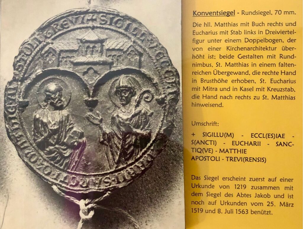Dank Bruder Thomas, der anhand einer ausführlichen Führung und mit launigen Worten Einblicke in die Historie der Abtei und des klösterlichen Lebens der Benediktiner gab, erfuhren wir, dass die Abtei bereits seit dem 5.Jahrhundert existiert. Bischof Cyrillus von Trier ließ damals die Grabstätte für die Gründerbischöfe der Trierer Kirche Eucharius und Valerius errichten. Daraus ist die Abtei hervorgegangen. 1127 entdeckten die Benediktiner- mönche bei Bauarbeiten die Gebeine des Apostels Matthias. Die neue noch unvollendete Abteikirche wurde 1148 außergewöhnlicher Weise von Papst Eugen III. geweiht. Daraufhin setzten große Pilgerström zu der nach dem Apostel Matthias benannten Abteikirche ein. Auch heute noch ist die romanische Basilika, die das einzige Apostelgrab auf deutschem Boden beherbergt, die bedeutendste Pilgerstätte der Matthiasbruderschaften. Zudem wird in der nördlichen Seitenkapelle das als „Mattheiser Gnadenbild“ bekannte Marienbild verehrt.